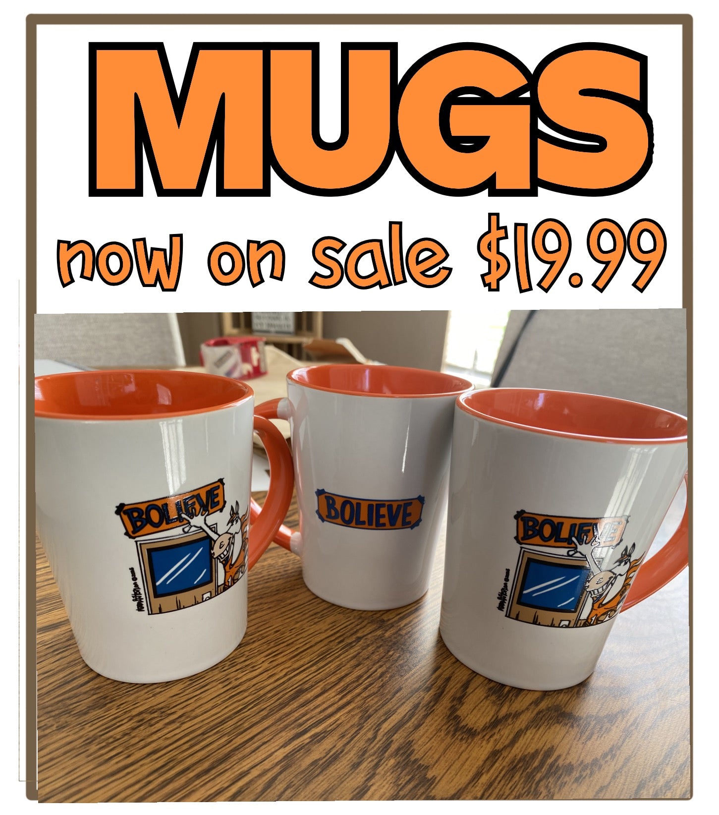Introducing our Broncos Bolieve coffee mugs! Just in time for those crisp Autumn mornings with fluttering leaves, hot coffee and the Broncos on TV. Grab your 15 oz of Glory. On sale now until supplies last!